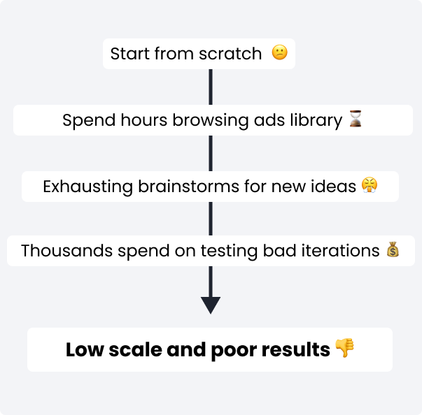 Tired of staring at your ads, waiting for inspiration to hit? Upload your ad, and let our AI suggest winning iteration ideas based on a dataset of over 1.7 million high-performing Meta ads